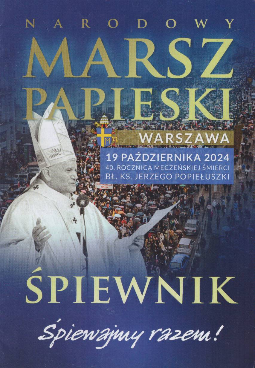 NARODOWY Marsz Papieski. Warszawa 19 października 2024. 40. rocznica męczeńskiej śmierci bł. ks. Jerzego Popiełuszki. Śpiewnik. Śpiewajmy razem. /bmw/ 2024. bwyd. s.7. opr. oryg. papierowa. 20 cm.