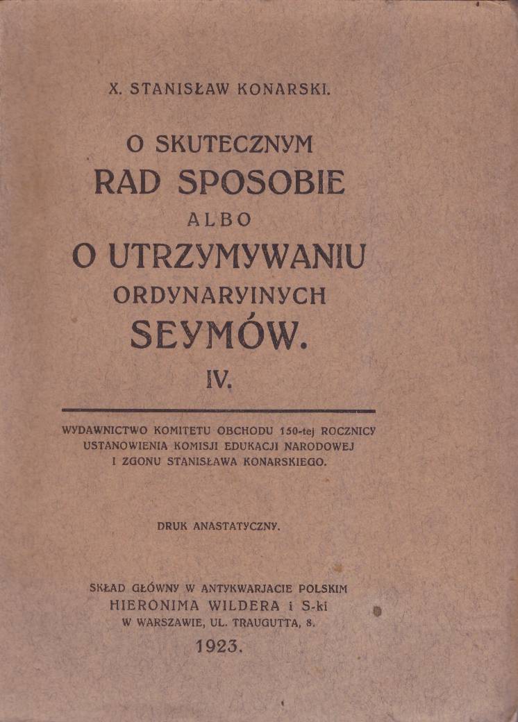 KONARSKI Stanisław, O skutecznym rad sposobie albo O utrzymywaniu ordynaryinych seymow. Część czwarta y ostatnia. Warszawa 1763. Drukarnia J. K. Mći y Rzpltey u XX. Scholarum Piarum. s.310. opr. oryg. kartonowa. 18 cm.