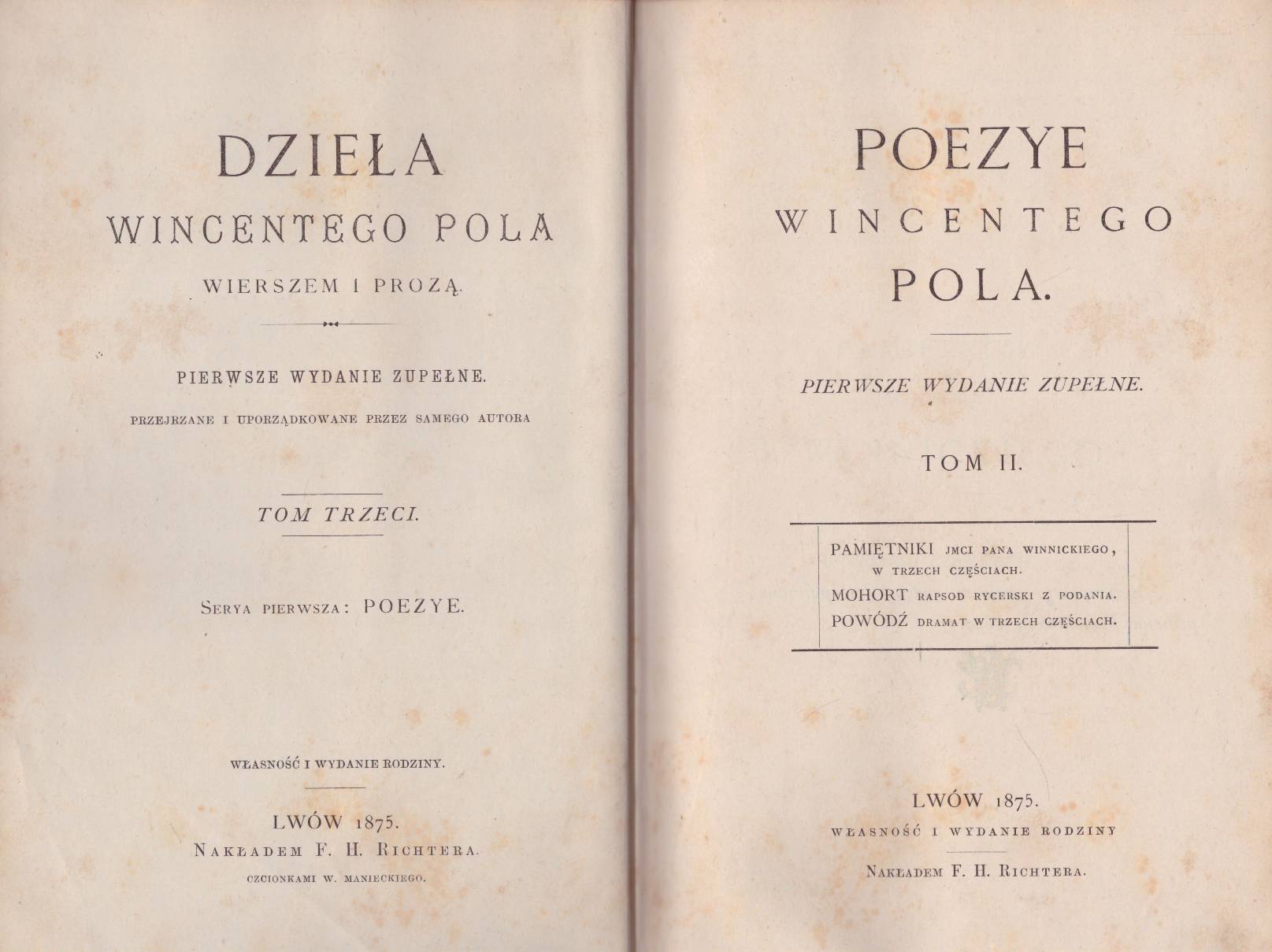 POL Wincenty,  Dzieła Wincentego Pola wierszem i prozą. Pierwsze wydanie zupełne przejrzane i uporządkowane przez samego autora. Tom trzeci. Serya pierwsza: Poezye. Własność i wydanie rodziny. Lwów 1875. Nakładem F. H. Richtera.